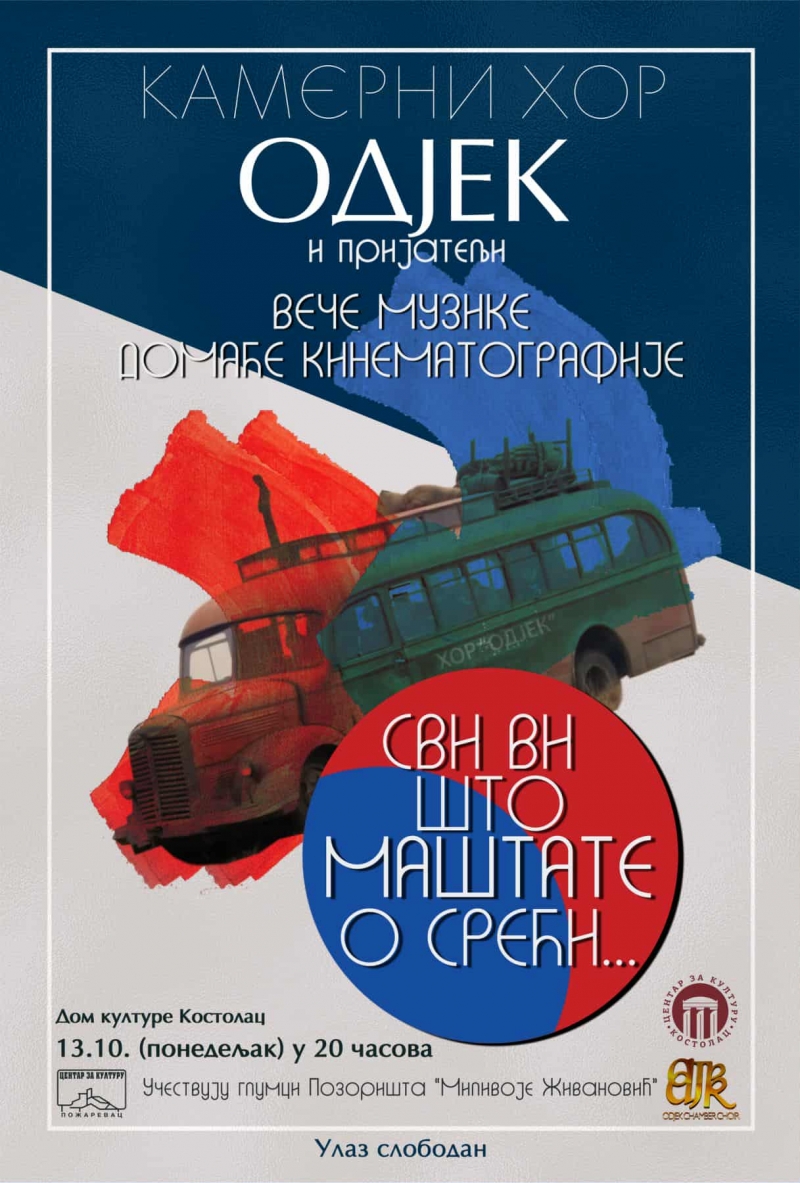 U Domu kulture u Kostolcu, u ponedeljak 13. oktobra, biće održan koncert kamernog hora „Odjek“ iz Požarevca i njihovih prijatelja pod nazivom „Svi vi što maštate o sreći“. Ovaj muzički događaj počinje u 20 sati, i posvećen je obeležavanju Dana oslobođenja Kostolca.