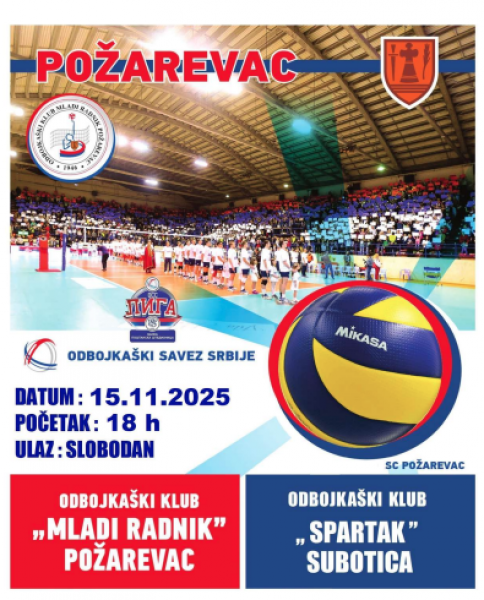 Utakmica između Odbojkaškog kluba “Mladi radnik” i OK “Spartak” Subotica biće odigrana u subotu, 15. novembra, u Sportskom centru “Požarevac”.