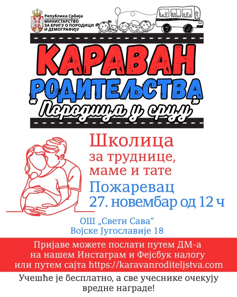 Manifestacija „Karavan roditeljstva – Porodica u srcu“, koju organizuje Ministarstvo za brigu o porodici i demografiju sa ciljem jačanja porodica širom Srbije, biće održana 27. novembra, u Osnovnoj školi „Sveti Sava“ u Požarevcu.