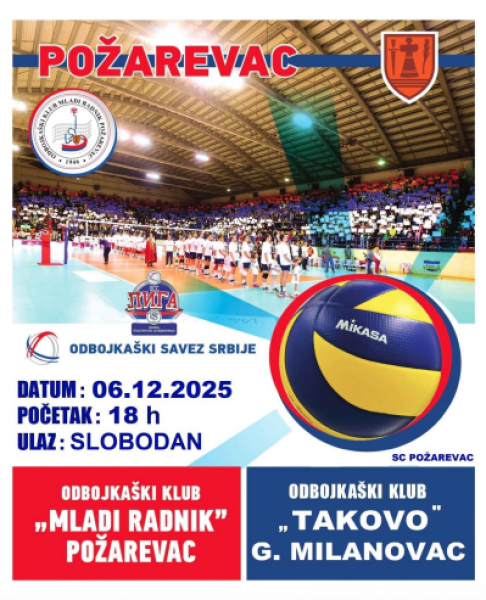 Odbojkaši “Mladog radnika” ugostiće ekipu OK “Takovo” iz Gornjeg Milanovca u subotu, 6. decembra, u Sportskom centru “Požarevac”.