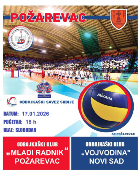 Utakmica između Odbojkaškog kluba „Mladi radnik“ iz Požarevca i OK „Vojvodina“ iz Novog Sada odigraće se u subotu, 17. januara, u Sportskom centru „Požarevac“,