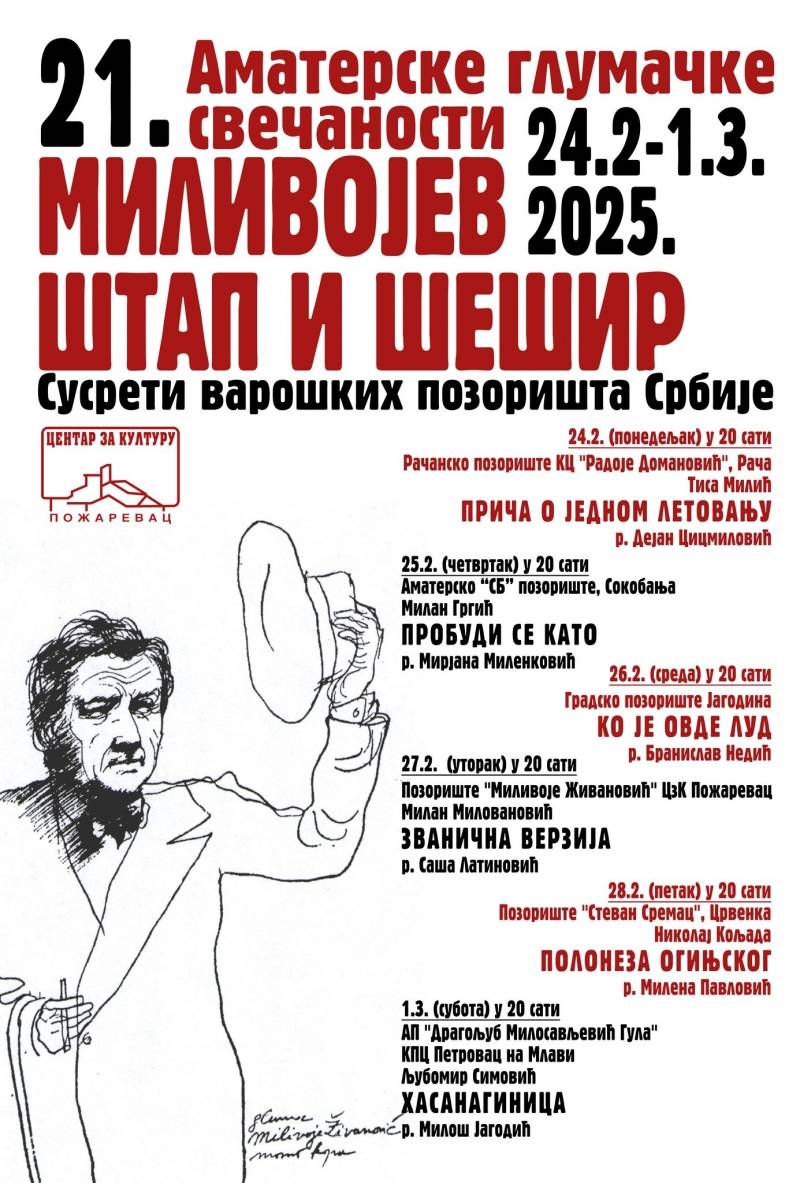 Od 24. februara do 1. marta, Centar za kulturu Požarevac biće domaćin Amaterskih glumačkih svečanosti „Milivojev štap i šešir”. Ove godine na festivalu, učestvovaće pozorišta iz Rače, Sokobanje, Jagodine, Požarevca, Crvenke i Petrovca na Mlavi.