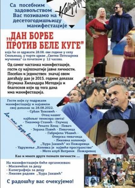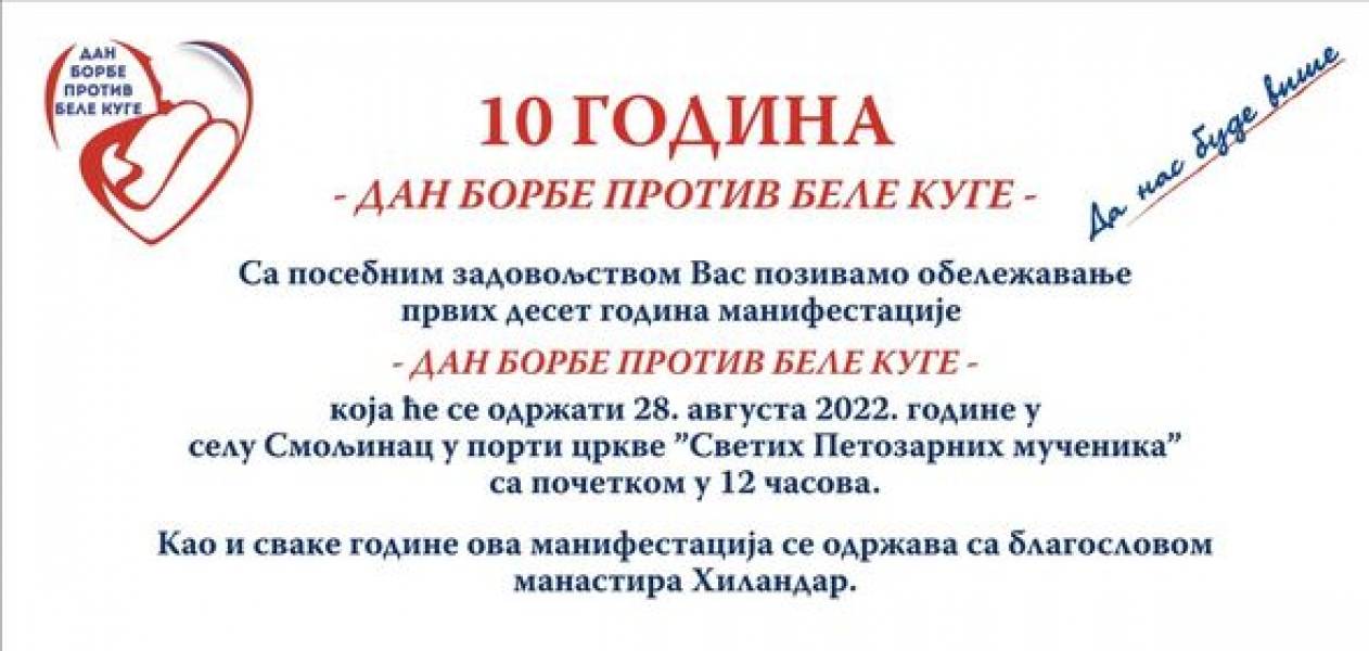 Manifestacija “Dan borbe protiv bele kuge” održaće se u nedelju 28. avgusta u selu Smoljinac, u porti crkve ‘’Svetih Petozarnih mučenika’’ sa početkom u 12 sati.