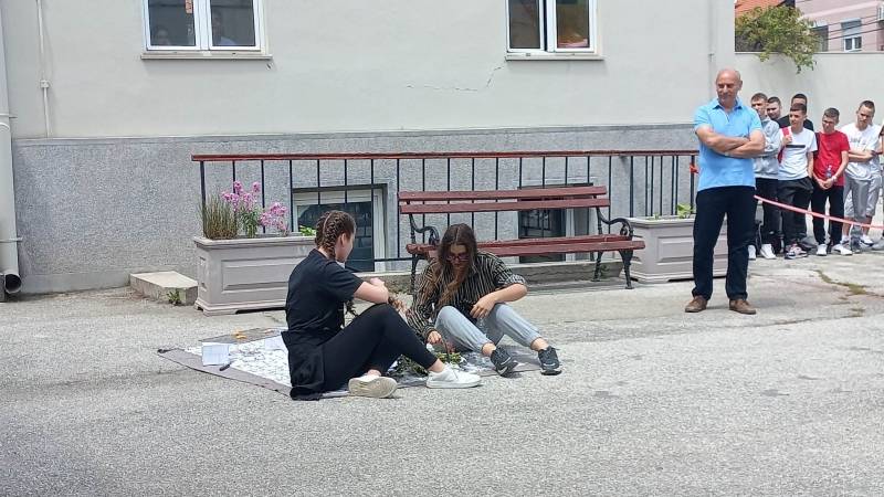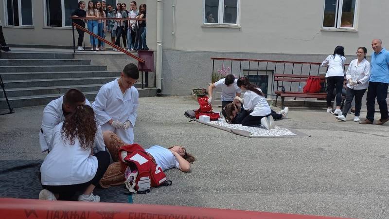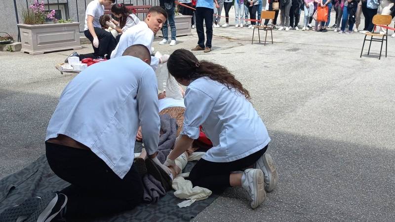 U dvorištu škole, organizovana je i pokazna vežba prve pomoći i realistički prikaz povreda i stanja.