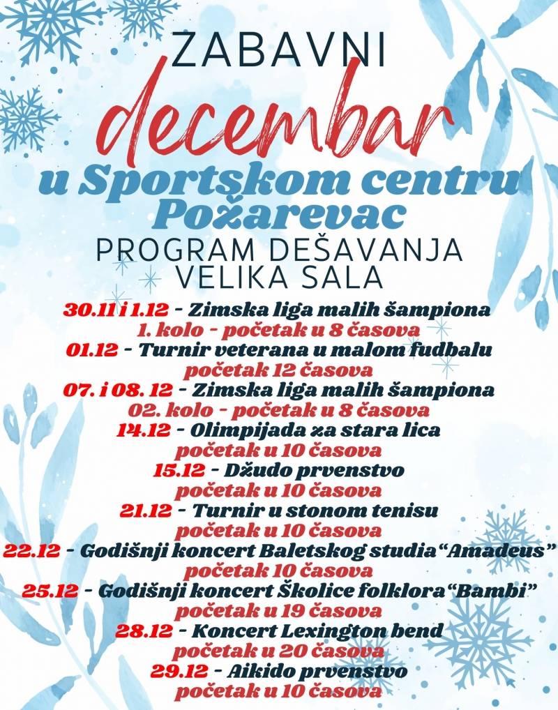 Sportski centar Požarevac pripremio je bogat program za decembar, koji će zadovoljiti sve ljubitelje sporta i kulture. U mesecu koji je pred nama, očekuju nas raznovrsni događaji koji će okupiti takmičare i posetioce iz različitih sportskih disciplina, kao i muzičke nastupe koji će obogatiti prazničnu atmosferu.