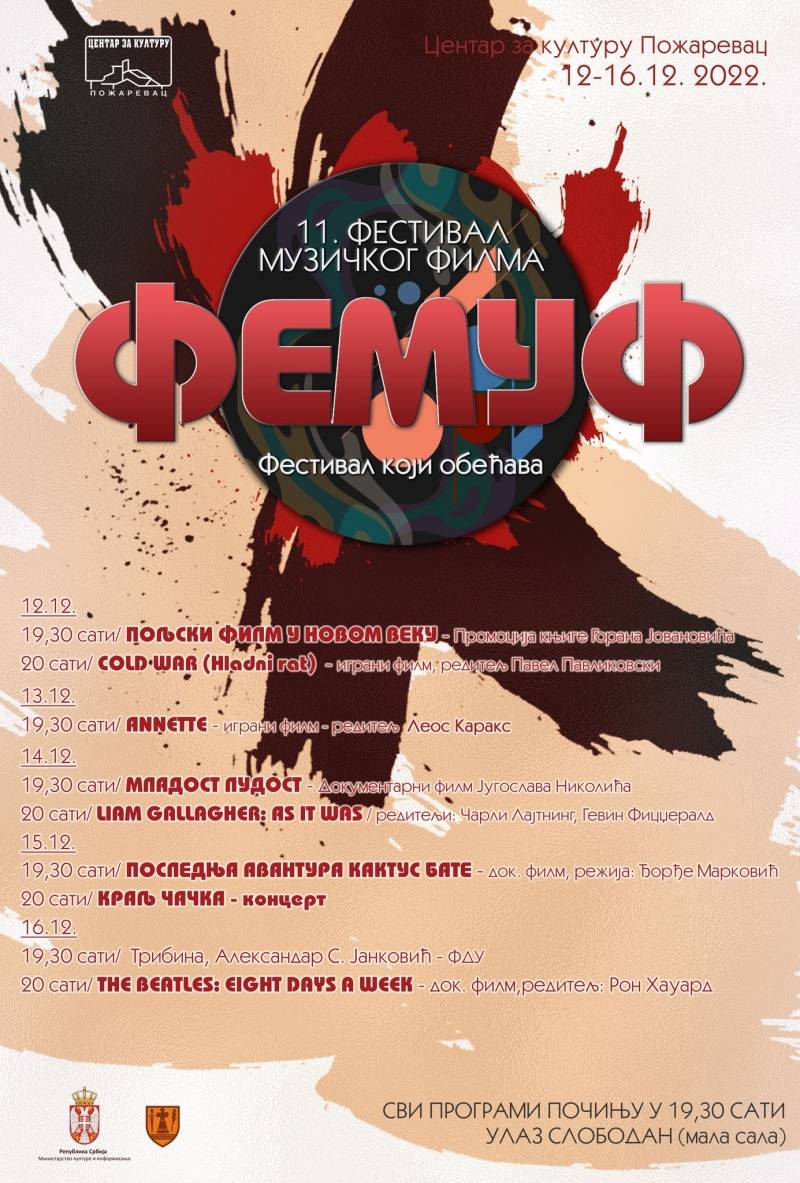Festival muzičkog filma ‘’Femuf’’ počinje 12. decembra u požarevačkom Centru za kulturu i trajaće do petka 16. decembra.