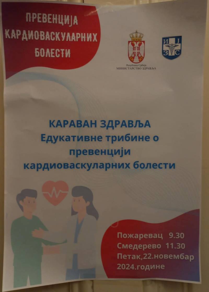 Ministarstvo zdravlja, u saradnji sa Institutom za javno zdravlje Srbije "Dr Milan Jovanović Batut", prošle nedelje pokrenulo je program "Karavan zdravlja", koji obuhvata edukativne tribine posvećene prevenciji kardiovaskularnih bolesti. Prve tribine održane su u Negotinu i Kladovu, a danas je na redu tribina u Požarevcu.