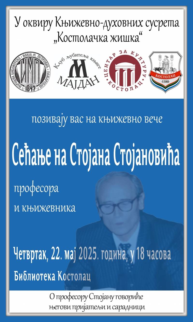 U okviru Književno - duhovnih susreta „Kostolačka žiška“, održaće se književno veče "SEĆANjE NA STOJANA STOJANOVIĆA", profesora i književnika.