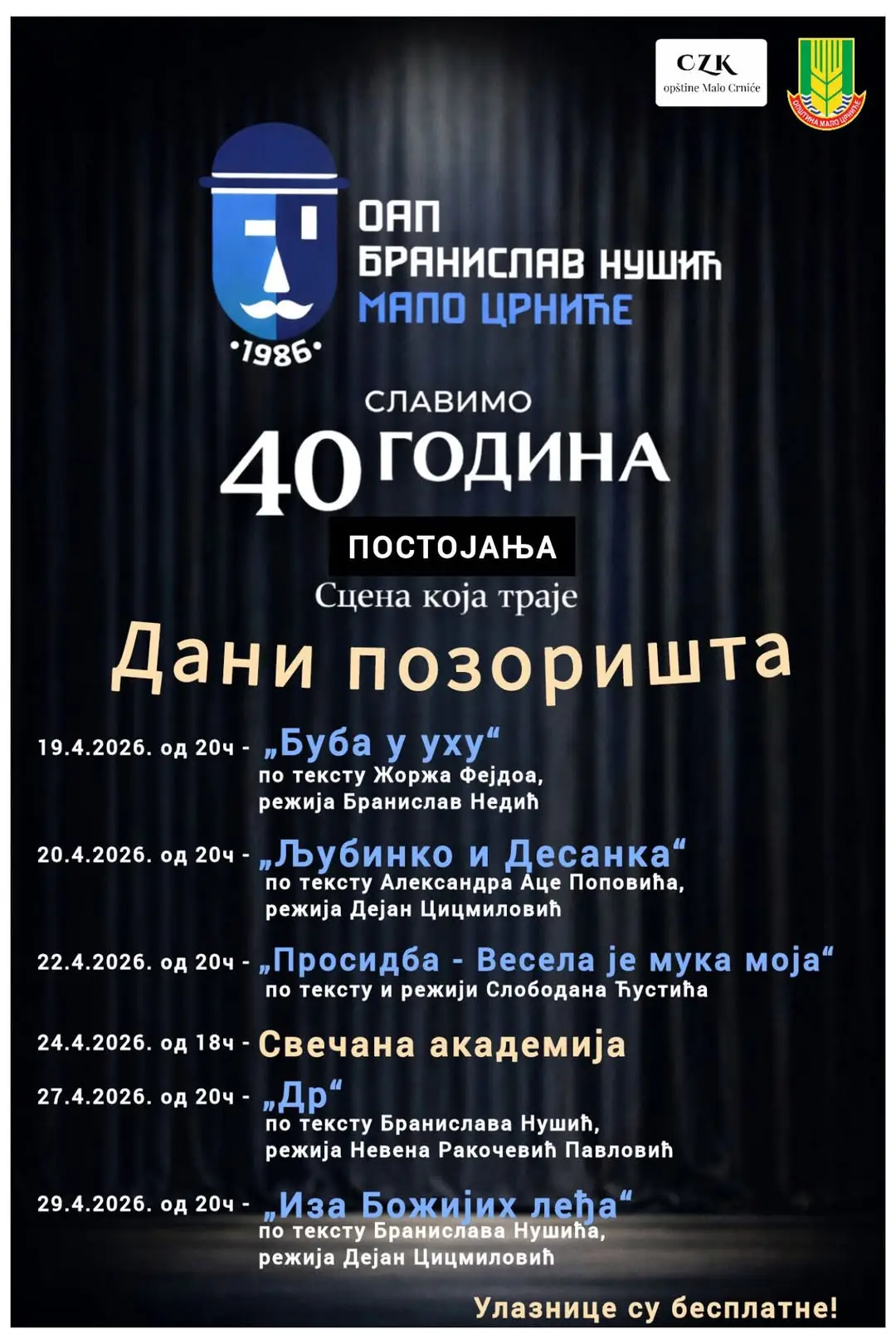 Nikola Tomić direktor Centra za kulturu Malo Crniće, ističe da je reč o značajnom jubileju za amatersko pozorište koje već četiri decenije okuplja ljubitelje dramske umetnosti iz cele opštine, ali i šire.