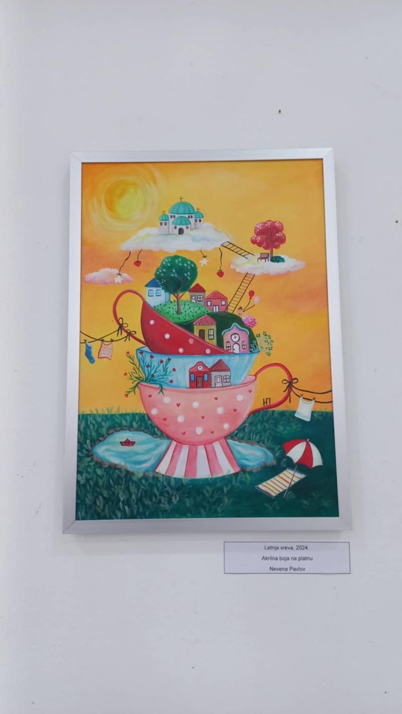 „Minja stvara nefigurativnu umetnost sa gusto teksturiranim slojevima boje na platnu u kombinaicji sa drugim materijalima. Slike Minje Miletić iz predstavljenog ciklusa „Metamorfoza uma“ rađene su u duhu enformela gde se sučeljavaju materija i energija sa krajnjim ishodištem u apstraknoj slici. Miletić je slikajući promenu unutarnjeg stanja čoveka, njegove emotivne i psihološke strane, nadogradila svoj slikarski izraz kroz vrtložne poteze četkice u prigušenim bojama, isprepletene svetlucavim zlatnim akcentima. Nastalo vizuelno iskustvo, prati i tematiku ciklusa posvećenoj ljudskoj unutarnjoj metamorfozi. Nevena Pavlov se najviše usmerava ka ikonopisu. Ona ostaje u domenu slikarstva kasne vizantijske umetnosti koju, između ostalog, obeležava izražena nežnost i osećajnost koja se najviše oseća u prikazu majke i deteta kroz lik Bogorodice i malog Hrista. Nevena Pavlov je zainteresovana i za slikarstvo malog formata sa bogatim koloritom, koje upućuje na posebnu atmosferu i važnost malih stvari. Sklonost ka sočnom koloritu deli i Jelena Milisavljević. Boja i svetlost je najviše interesuju dok se inspiriše Van Gogogom, Salvadorom Dalijem, Fridom Kalo. Milisavljević demonstrira višestruku naklonost ka različitim stilovima među kojima nadrealizam preovlađuje, kao i beskrajne mogućnosti umetničke interpretacije pejzaža, kao jednog od glavnih žanrova slikarstva“, rečeno je na otvaranju izložbe.