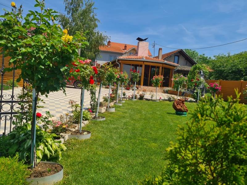 Poseban akcenat je dat na ružama u kombinaciji sa vidno održavanim travnjakom.