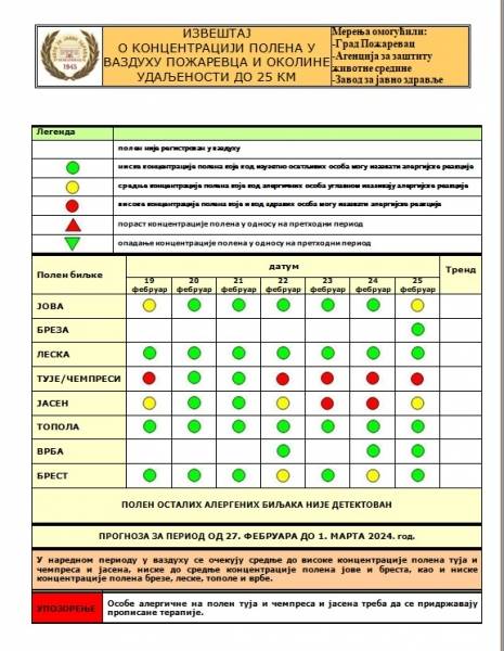 Kako se navodi u izveštaju do 1. marta, u vazduhu se očekuju srednje do visoke koncentracije polena tuja i čempresa, niske do srednje koncentracije polena jove i bresta, kao i niske koncentracije polena breze, leske, topole i vrbe.