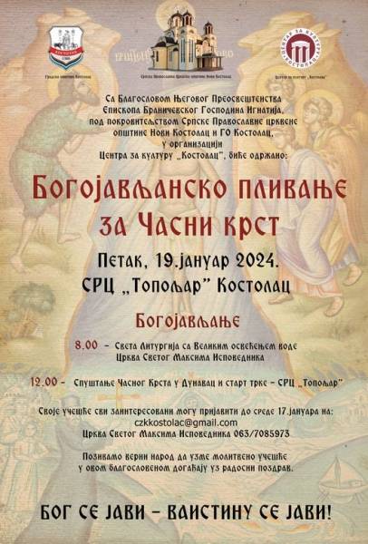 Na SRC „Topoljar“ u Kostolcu sa blagoslovom Njegovog Preosveštenstva Episkopa braničevskog Ignjatija, pod pokroviteljstvom Srpske Pravoslavne Crkvene opštine Novi Kostolac i GO Kostolac, u organizaciji Centra za kutluru „Kostolac“, biće održano BOGOJAVLjANSKO PLIVANjE ZA ČASNI KRST.