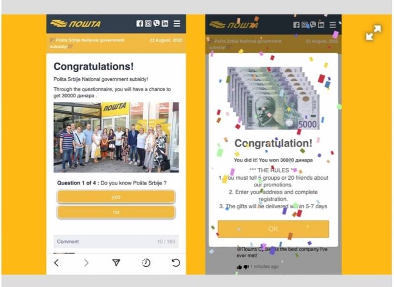 Javnom preduzeću „Pošta Srbije” prijavljen je novi pokušaj zloupotrebe logotipa i imena Pošte Srbije kojim se korisnicima putem platformi za komunikaciju i društvenih mreža, upućuje informacija o nagradnoj igri koju navodno organizuje Pošta Srbije, te da ukoliko odgovore na četiri pitanja imaju mogućnost da osvoje nagradu u iznosu 30.000 dinara.