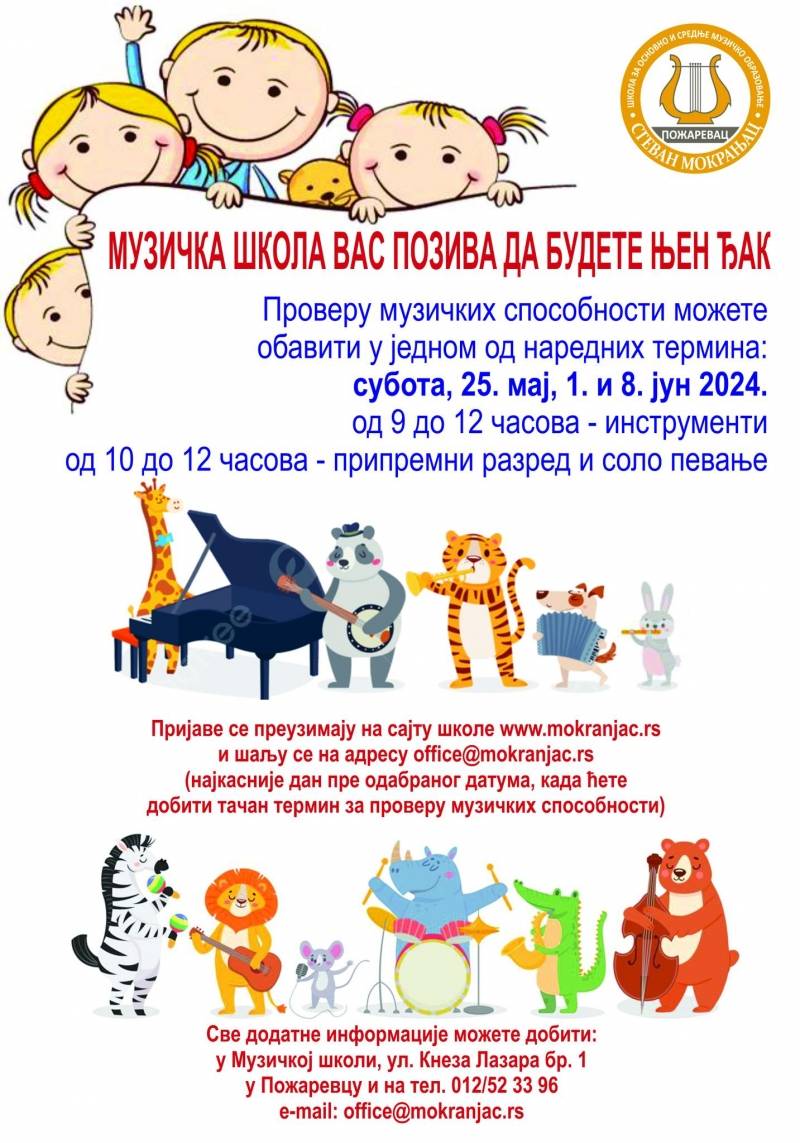 Škola za osnovno i srednje muzičko obrazovanje „Stevan Mokranjac“ iz Požarevca organizuje proveru muzičkih sposobnosti.