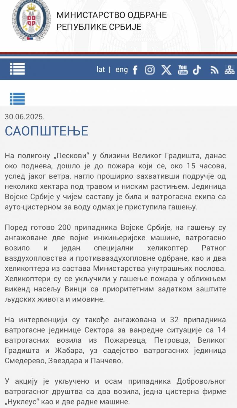 Ministarstvo odbrane Republike Srbije oglasilo se zvaničnim saopštenjem povodom velikog požara koji je u nedelju, 30. juna, izbio na poligonu „Peskovi“ kod Velikog Gradišta, a koji se usled jakog vetra proširio ka vikend naselju Vinci.