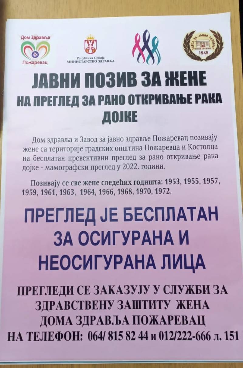 Od januara 2016. otpočeo je organizivani skrining raka dojke za žene starosti od 50 do 69 god čiji ukupan broj na teritoriji Požarevca i Kostolca iznosi 11 256 žena.