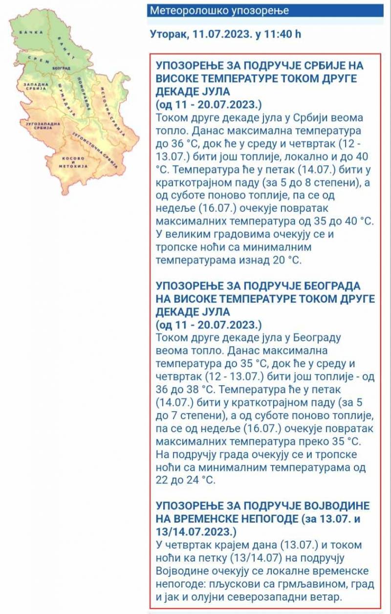 Republički hidrometeorološki zavod Srbije objavio je juče na svom sajtu, upozorenje na visoke temperature od 11. do 20. jula, ali i na vremenske nepogode u Vojvodini 13. i 14. jula.