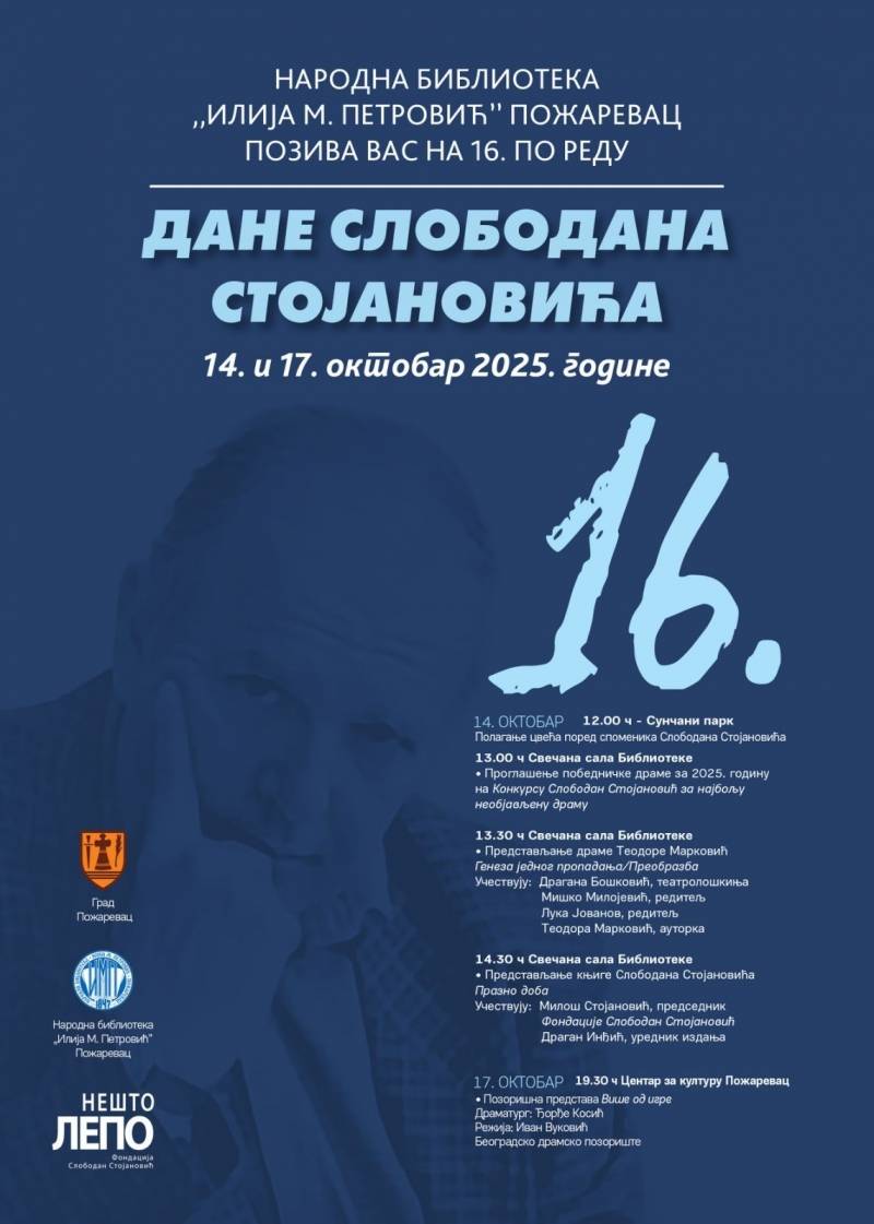 Narodna biblioteka „Ilija M. Petrović“ Požarevac organizuje šesnaeste Dane Slobodana Stojanovića, manifestaciju posvećenu sećanju na istaknutog dramskog pisca, reditelja i književnika.