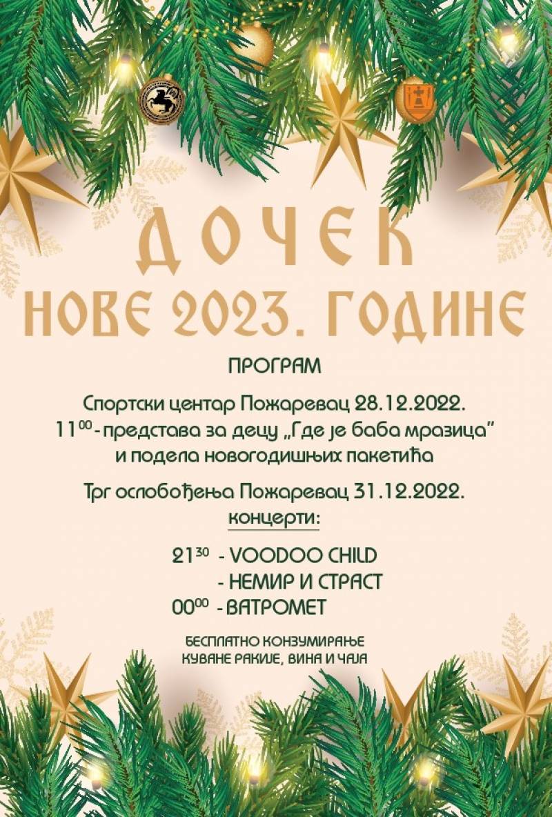 Doček Nove 2023. godine biće održan na Trgu oslobođenja u organizaciji Turističke organizacije grada Požarevca. Novogodišnja noć na trgu počinje u 21 čas, nastupom grupe “Voodoo child” iz Požarevca, a zatim i požarevačko-kostolačkog benda “Nemir i strast”.