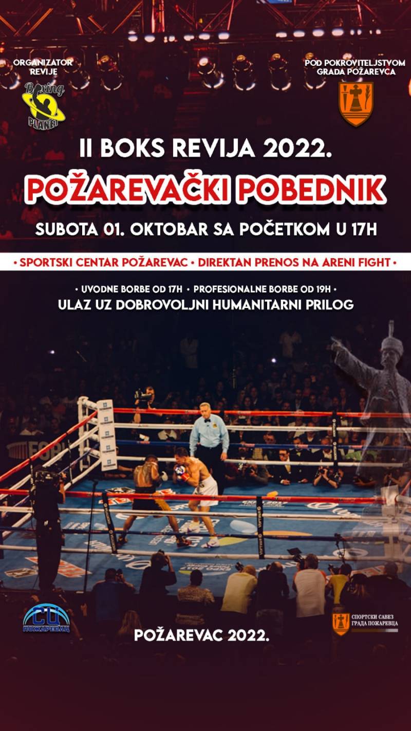 U Sportskom centru Požarevac u subotu 1. oktobra, biće druga po redu Boks revija "Požarevački pobednik" u organizaciji Bokserskog kluba „Boxing planet“ iz Požarevca.