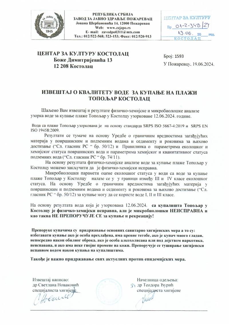 Uzorkovanjem vode na “Dunavcu” na “Plaži Topoljar” od strane Zavoda za javno zdravlje Požarevac, utvrđeno je da je voda fizičko-hemijski ispravna, ali je mikrobiološki neispravna i kao takva NE PREPORUČUJE SE za kupanje i rekreaciju, dok se ne utvrdi da voda odgovara svim propisanim uslovima.