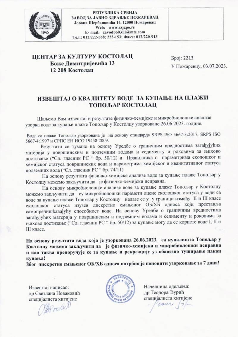 Ponovnim uzorkovanjem vode na “Dunavcu” na “Plaži Topoljar” od strane Zavoda za javno zdravlje Požarevac, utvrđeno je da je voda fizičko-hemijski i mikrobiološki ispravna, i kao takva PREPORUČUJE SE za kupanje i rekreaciju, uz obavezno tuširanje nakon kupanja.