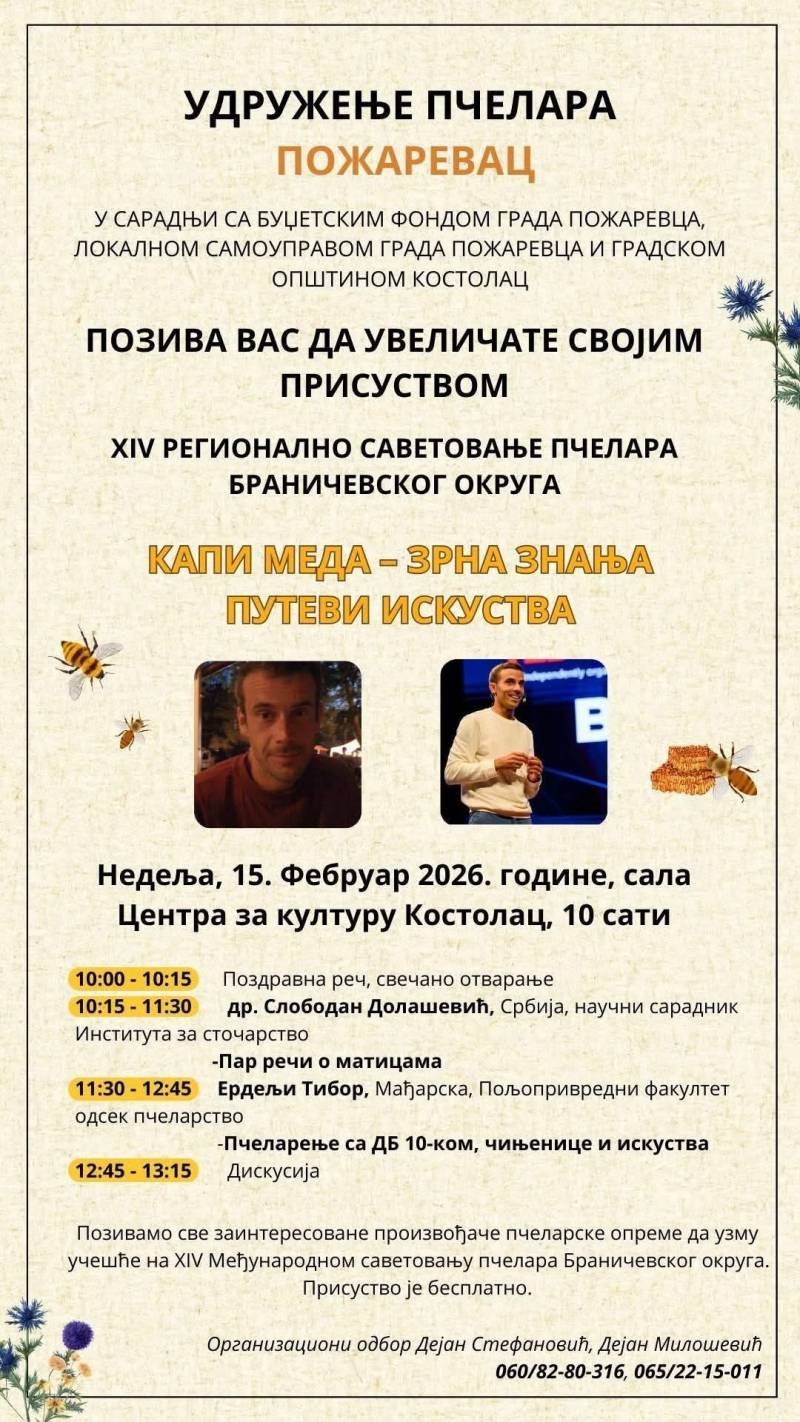 Skup će biti održan u nedelju, 15. februara 2026. godine, u sali Centra za kulturu Kostolac, sa početkom u 10 časova. Prisustvo je besplatno i otvoreno za sve zainteresovane pčelare, proizvođače pčelarske opreme i ljubitelje pčelarstva.